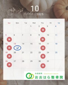2025.09.30 朝夕の風がぐっと涼しくなり、秋の深まりを感じる季節となりました。夏の疲れが出やすく、気温差で体調を崩しやすい時期でもあります。肩こりや腰痛、冷えからくる不調などが気になる方は、早めのケアがおすすめです。 おおはら整骨院矢田部院では、皆さまが元気に秋を楽しめるよう、丁寧な施術とセルフケアのアドバイスを行っております。どうぞお気軽にご相談ください。 🍂10月の休診日のお知らせ 毎週 木曜日・日曜日 10月13日(月・祝)体育の日 は17:00まで診療致します。 前ページ お知らせ一覧へ 次ページ
